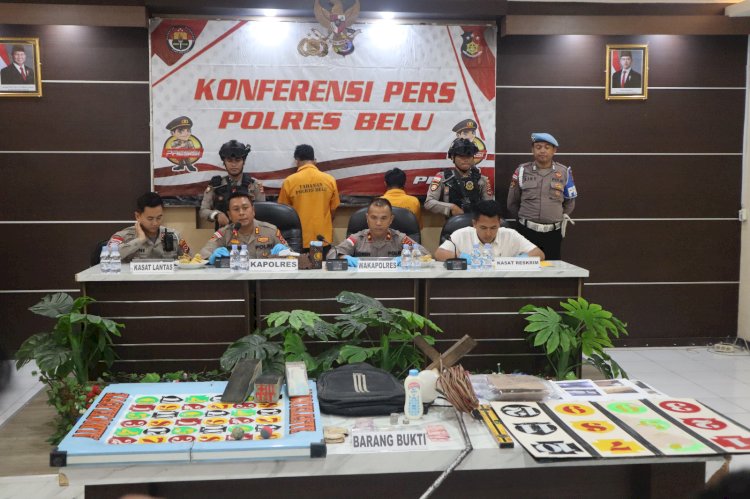 Selain menghadirkan 2 orang tersangka, Polres Belu dalam konferensi pers tersebut juga menghadirkan sejumlah barang bukti yang berhasil diamankan di lokasi penggerebekan antara lain berupa satu buah meja bola guling, 2 buah layar angka, 1 buah lampu, 1 buah tas warna hitam dan Uang sejumlah Rp. 1.672.500.