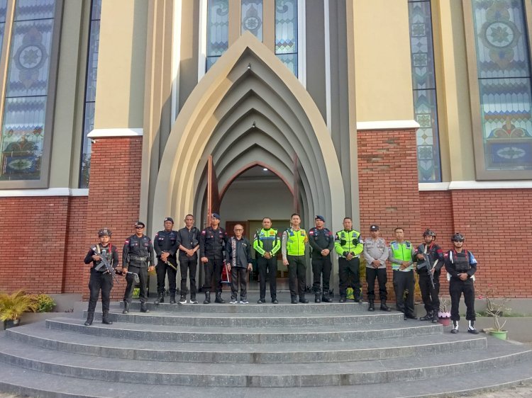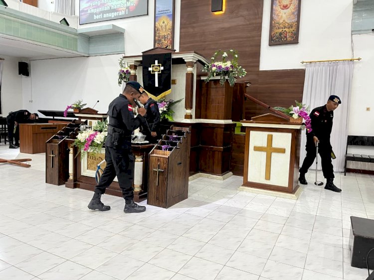 Jelang dimulainya misa Jumat Agung di kabupaten Belu, personel Gegana BP Batalyon A Sat Brimob Polda NTT didampingi personel operasi Semana Santa Polres Belu yang melaksanakan pengamanan Gereja, melakukan Sterilisasi di sejumlah Gereja besar di kota Atambua,jumat (03/04/2026).