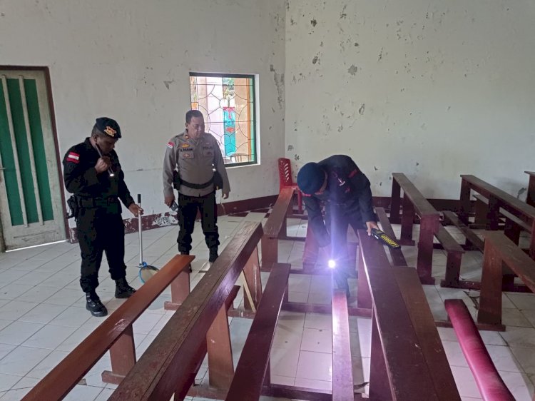Jamin Keamanan Saat Misa Jumat Agung, Personel Ops Semana Santa 2026 Polres Belu Dampingi Tim Gegana Brimob Lakukan Sterilisasi di Gereja
