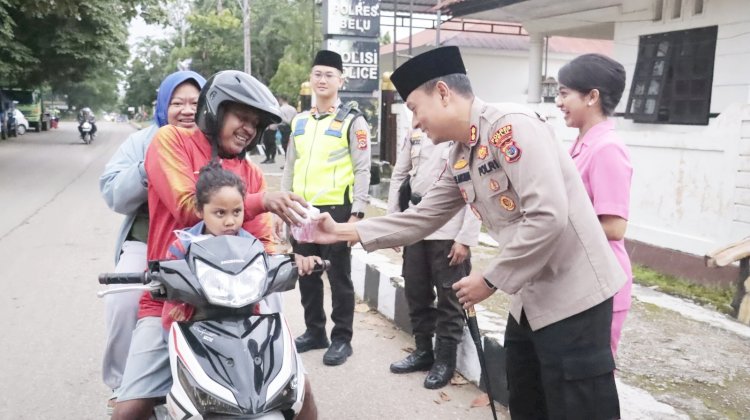 Guna memupuk tali silaturahmi dengan masyarakat khususnya umat Islam di bulan suci Ramadan 1447 H tahun 2026, Kapolres Belu, AKBP I Gede Eka Putra Astawa, S.H,, S.I.K didampingi Ketua Bhayangkari Cabang Belu, Ny.Asti Astawa, berbagi berkah lewat pembagian takjil untuk masyarakat kota Atambua, selasa (10/03/2026).