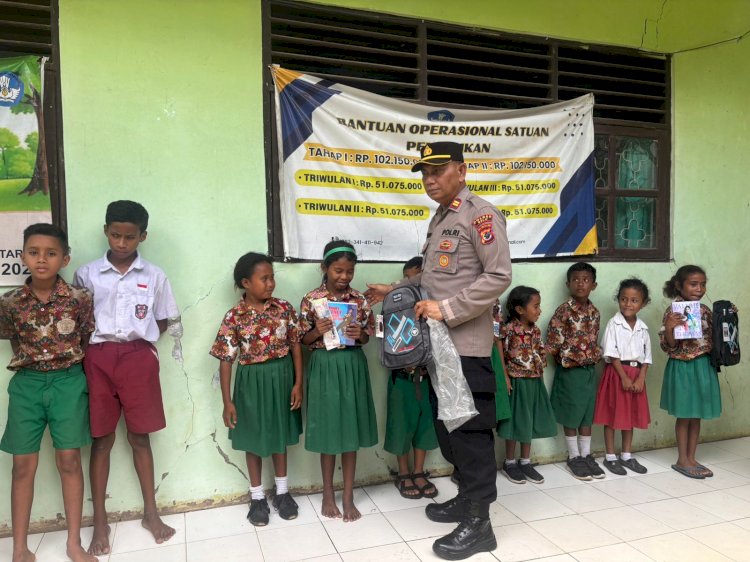 Peduli Pendidikan di Batas Negeri, Polres Belu Polda NTT Salurkan Tas dan Alat Tulis Untuk Anak-anak SDI Haliulun